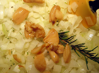 Using a large pot with a heavy bottom, saute onion and fresh minced garlic in remaining 1 tsp. olive oil over medium heat. Sprinkle generously with salt and pepper, add minced rosemary and one intact bushy stem; stir well and cover for about 5 minutes. Uncover, stir again and roasted garlic. Simmer another 5 minutes or until onions are soft and translucent.